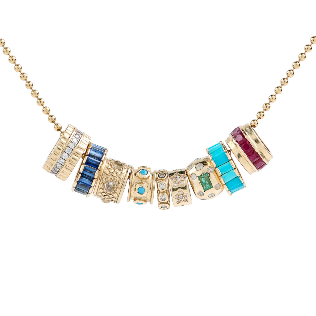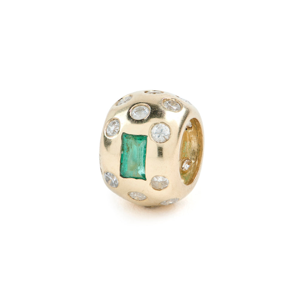 This 14k yellow gold roundel features beautiful diamonds and emeralds and looks gorgeous when stacked up on your favorite gold chain!